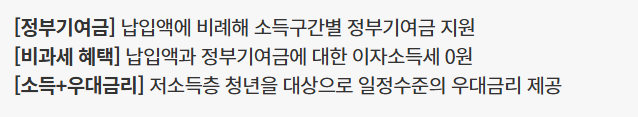 가입자에게는 은행 이자 외에도 정부기여금이 매달 지원되며, 이자소득에 대한 비과세 혜택도 주어집니다. 또한 저소득층 청년에게는 별도의 우대금리가 적용될 수 있어 더 유리한 조건으로 자산을 키울 수 있습니다.
